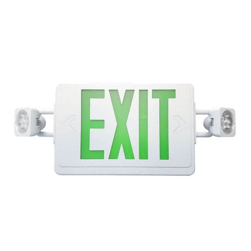 C-Lite LED Exit & Emergency Light Combo with white housing. Green letters, single or double face, battery back-up, remote capable, UL listed, 5-year limited warranty